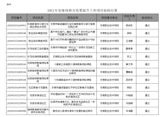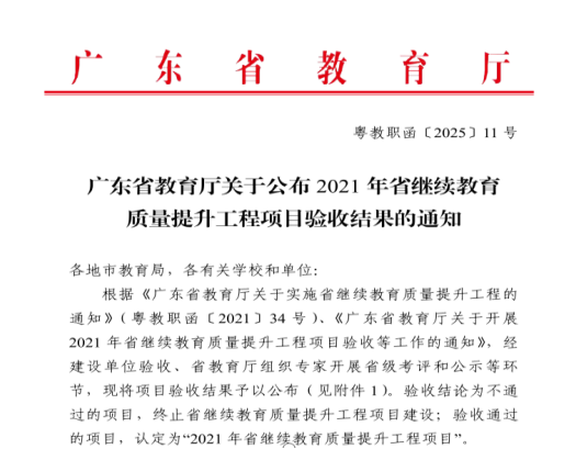 4月2日,广东省教育厅正式公布2021年省继续教育质量提升工程项目验收结果,我校12个立项项目全部通过验收,这标志着学校在继续教育领域的内涵建设与质量提升方面取得良好成效。