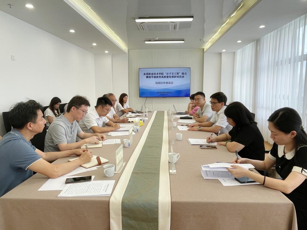 我校一行深入参观了横沥镇第二幼儿园,实地掌握园所发展情况和实际办学需求。座谈会上,周宇锋副镇长希望依托东职院专业优势,通过实习实训等输送人才;联合东莞市学前教育研训与评估中心的师资力量提升教师教科研水平;共建实训基地,探索“智慧教育”等试点项目。蔡东宝副书记表示,学校将充分发挥高校人才优势,推进家园校协同共育机制,结合横沥镇百年牛墟文化特色,在办园特色凝练、园本课程开发、教科研项目申报等方面深度合作,积极服务横沥镇学前教育内涵式发展。