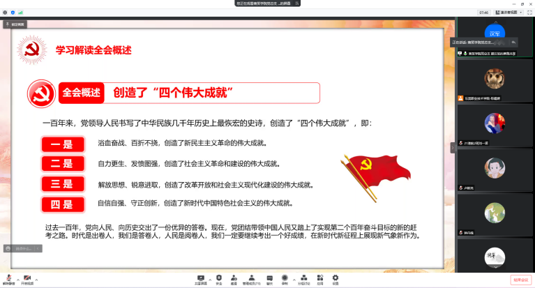 颜汉军教授讲课的主题为《聚焦党的十九届六中全会 不忘初心 砥砺前行》,他带领同学们学习了十九届六中全会精神,并从大会召开背景、重大成就、历史经验等几个方面进行了具体讲述。颜汉军教授指出党的十九届六中全会深刻、系统地总结了我们党成立以来的重大成就和历史经验,具有重大现实意义和深远历史意义,他鼓励学子们要不忘初心,砥砺前行勇担当。