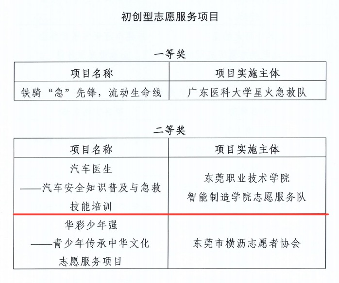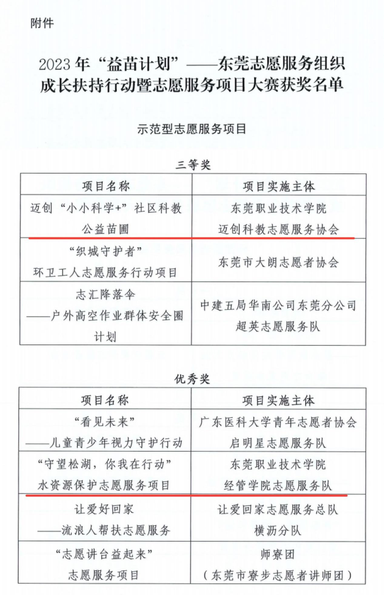 近日,共青团东莞市委员会、东莞市精神文明建设委员会办公室、东莞市民政局等17个单位联合下发《关于2023年“益苗计划”——东莞志愿服务组织成长扶持行动暨志愿服务项目大赛获奖名单的通报》,我校共有5个志愿服务项目获奖,其中智能制造学院“汽车医生”汽车安全知识普及与急救技能培训项目获初创型二等奖;启创科教志愿服务协会“小小科学+”社区科教公益苗圃和建筑学院“寻美莞乡”乡村振兴志愿服务活动分别获示范型、培育型三等奖;经济与管理学院“守望松湖,你我在行动”水资源保护志愿服务项目和数字媒体学院“牵·伴——智跨鸿沟”数字助老志愿服务项目分别获示范型、培育型优秀奖。我校获评优秀组织奖。