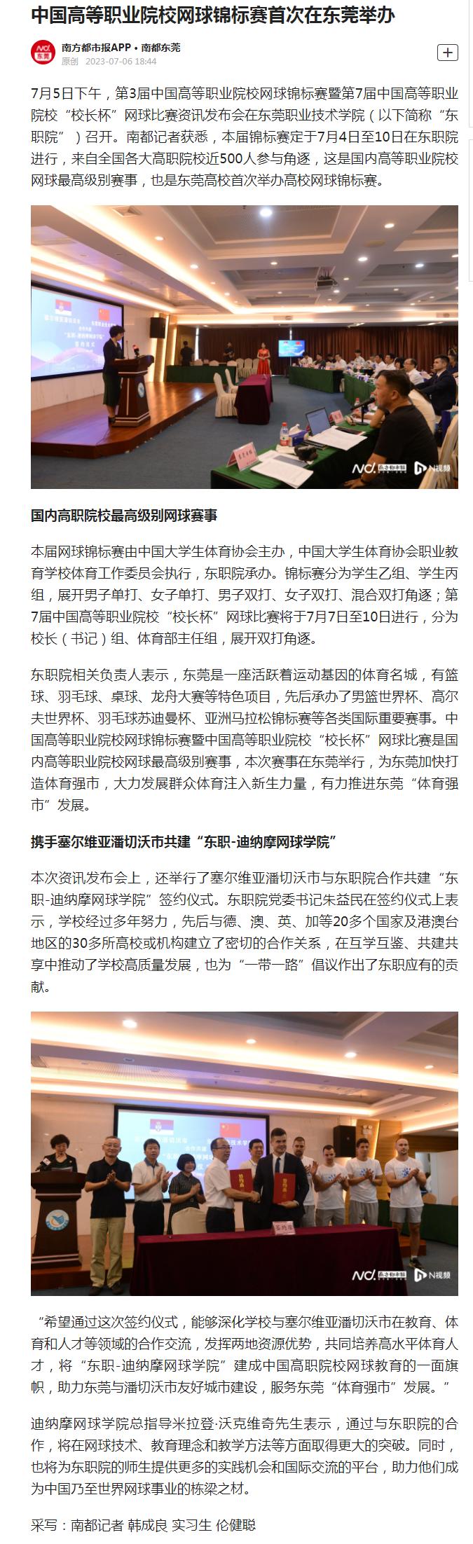 【南方都市报】中国高等职业院校网球锦标赛首次在东莞举办